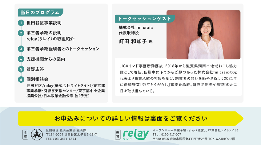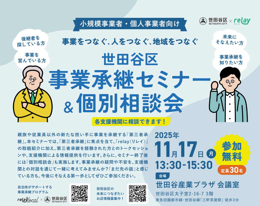 本セミナーでは、「第三者承継」に焦点を当て、世田谷区の事業承継マッチングプラットフォーム「relay(リレイ)」の取組紹介に加え、実際に第三者承継を経験された方をお招きしたトークセッションや、さまざまな支援機関による情報提供を行います。さらに、セミナー終了後には各支援機関と直接相談ができる「個別相談会」も実施します。