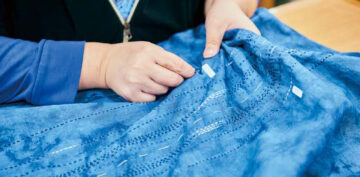 2階の織りや刺し子をする工房では、藍染めの生地に刺し子などを施し、商品に加工しています。裁断した残りの不規則な端切れは、パッチワークとして利用。トートバッグなどの商品に生かされるのです。